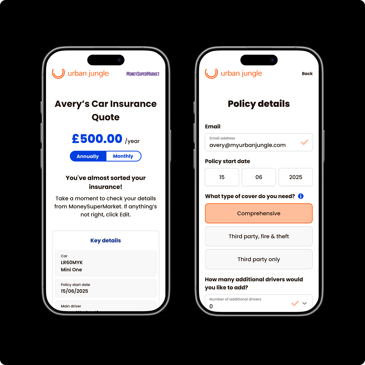 Designed a new car insurance product that balances insurer-hosted pricing constraints with a low-friction purchase experience for customers arriving via price comparison websites.