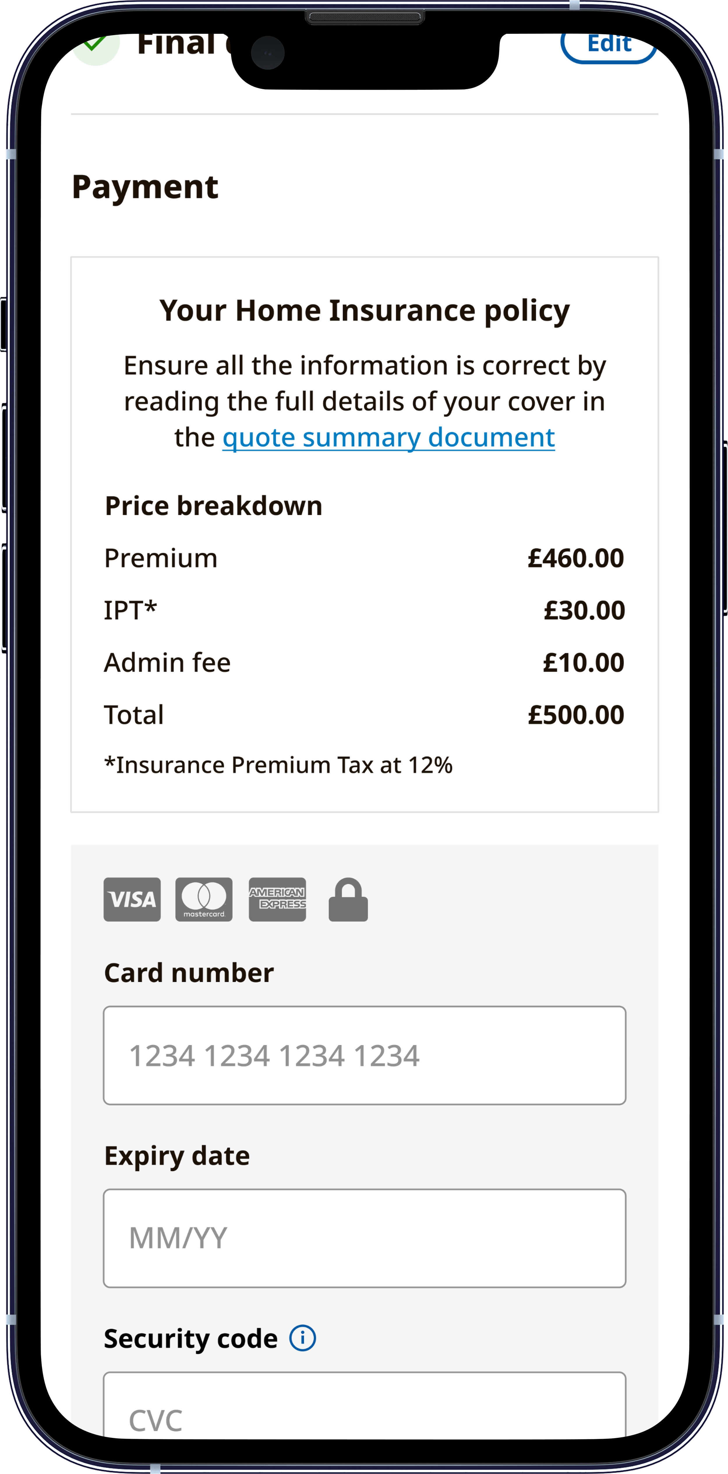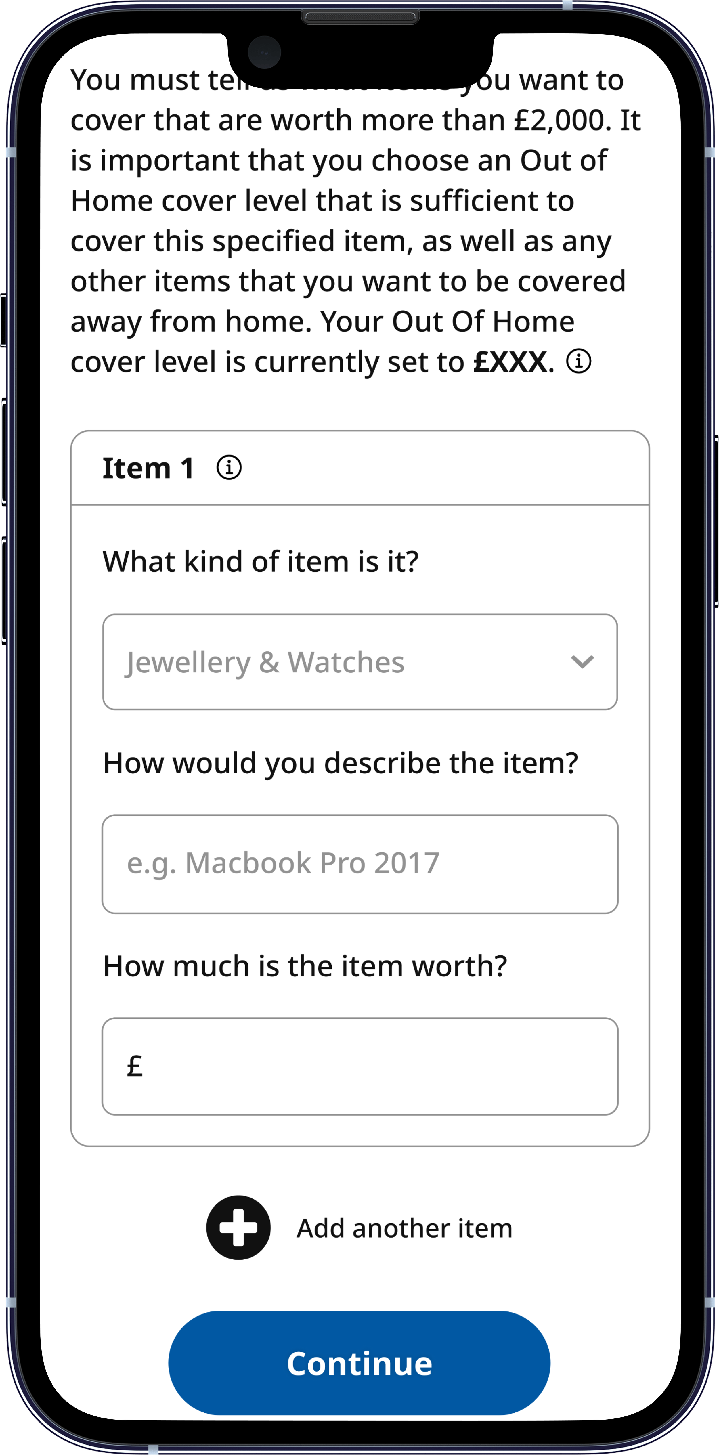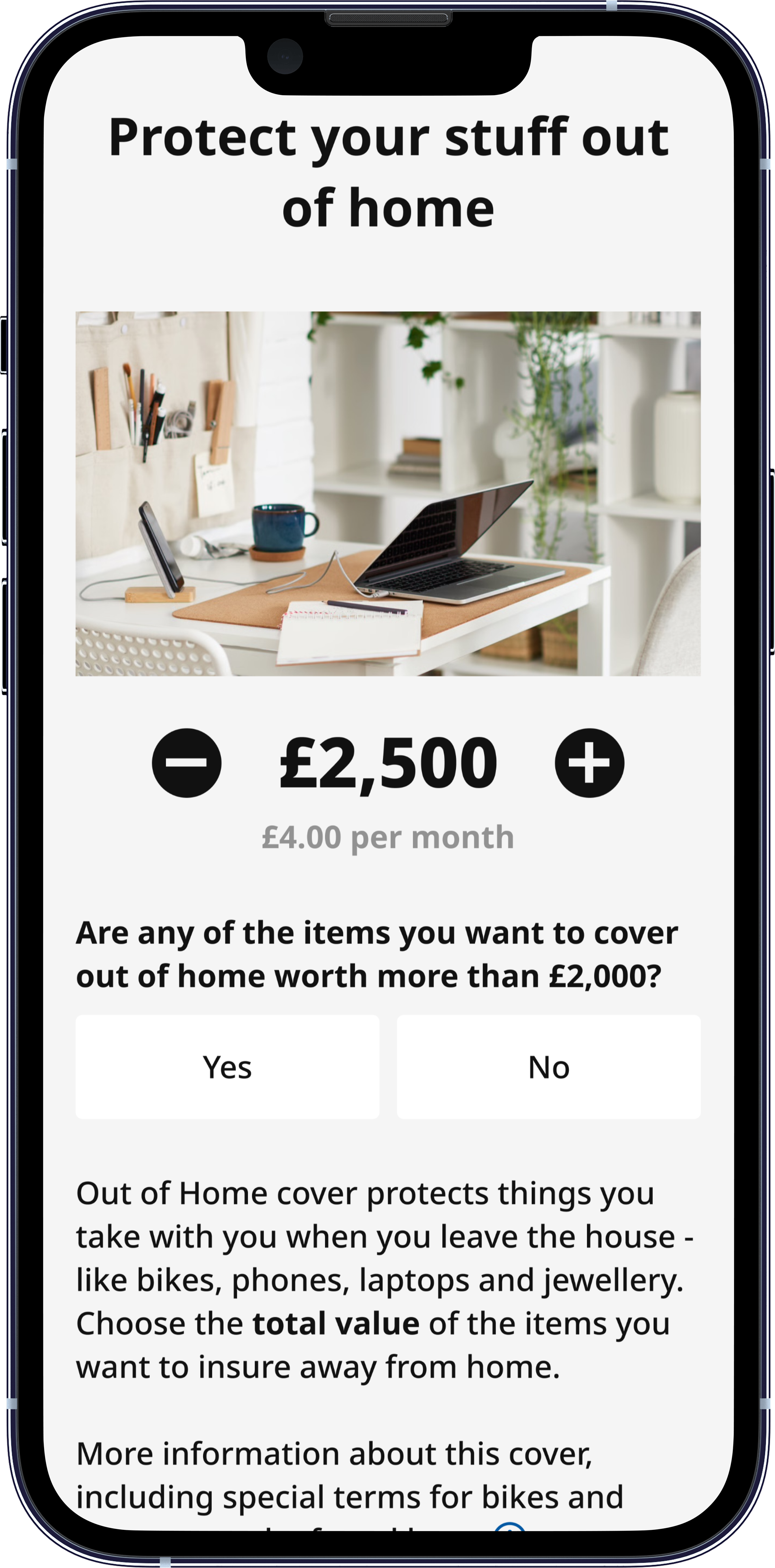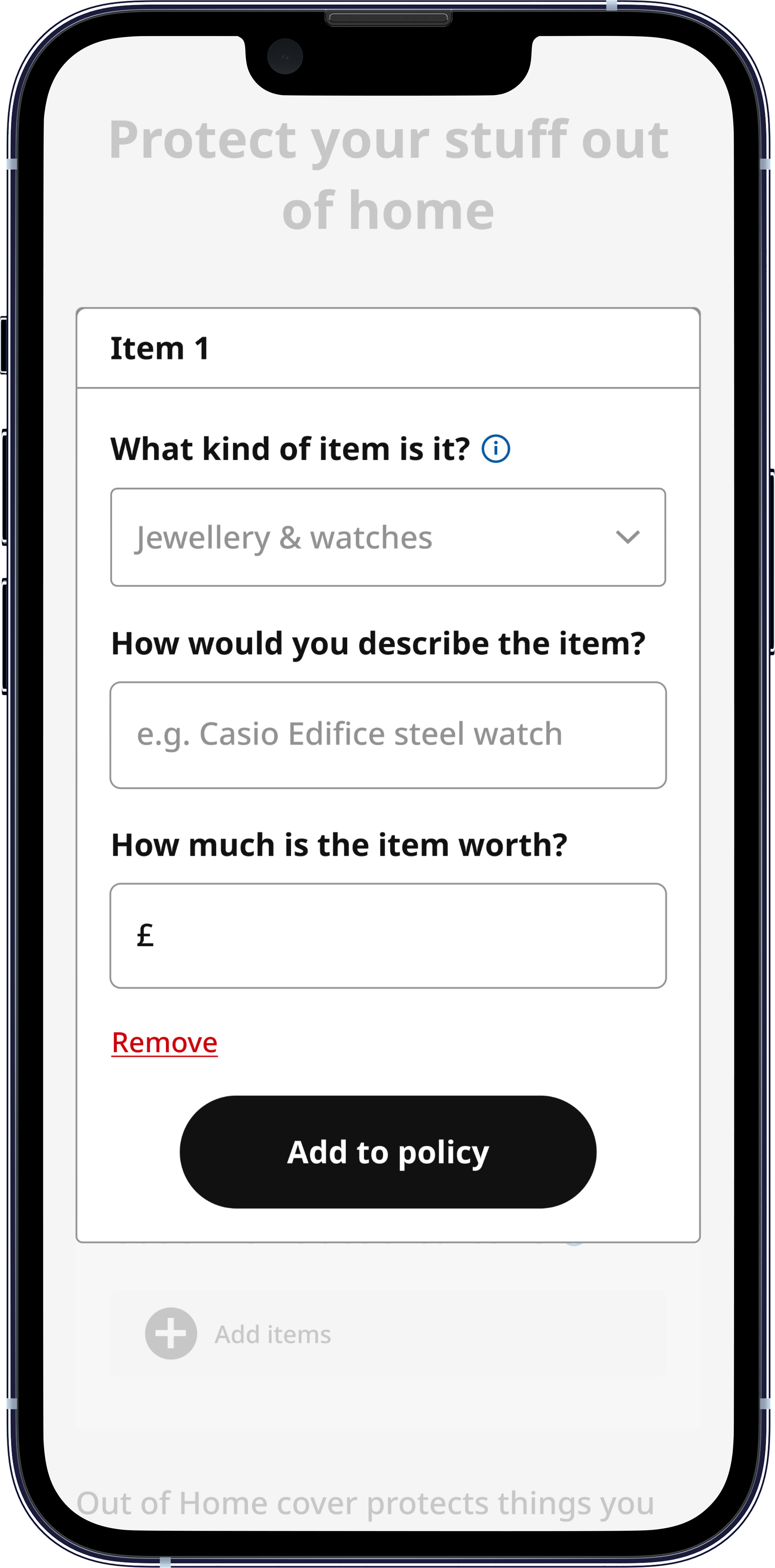 The original out of home cover flow required customers to navigate to a separate, standalone page to declare individual items valued over £2,000. Sitting outside the main purchase journey, it created an abrupt context switch at exactly the point where customers are closest to completing. Hotjar recordings and conversion funnel data confirmed this was a meaningful source of friction with >4% of customers dropping out of journey on this page.